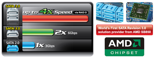 Yet another onboard feature of GIGABYTE AMD 800A series motherboards are integrated the latest AMD SB850 chip for high-speed SATA Revision 3.0 compatibility, delivering 6 ports native superfast 6Gbps link speeds for twice the data transfer rates of SATA Revision 2.0 (3 Gbps) and RAID 0, 1, 5, 10 support. When used in RAID 0 (Stripe) mode, GIGABYTE AMD 800A series motherboards offer even faster data transfer rates of up to 4x the speed of current SATA interfaces.