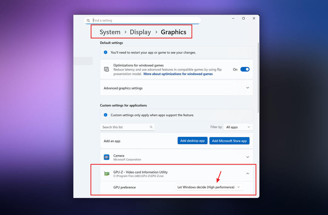 4. Once added, click to expand the options for a certain app, and navigate the "GPU preference" drop-down menu.