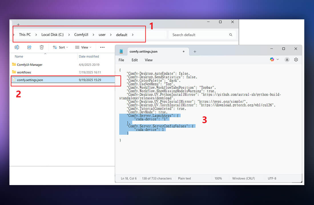 The "cuda-device" number tells ComfyUI which GPU to use (0 = first GPU, 1 = second, etc.). Because the AI BOX is a hot-pluggable device and Windows resource allocation can be dynamic, the numbering is not fixed. We recommend testing a few times to see if your image generation is using the intended GPU.