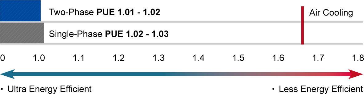In terms of cooling efficiency, two-phase and single-phase liquid immersion cooling both have far better performance than air-cooled data centers. Two-phase liquid immersion cooling can be connected to an external air cooling or water cooling system for different external environments. In some currently running data centers, two-phase immersion cooling systems have been shown to achieve a Power Usage Effectiveness (PUE) score of 1.02. When single-phase liquid immersion cooling systems are connected to an external cooling system the PUE score can reach as low as 1.03. In comparison, air cooling systems have a PUE between 1.4 and 1.7, which is still efficient, but immersion cooling has shown there is room for improvements in efficiency.