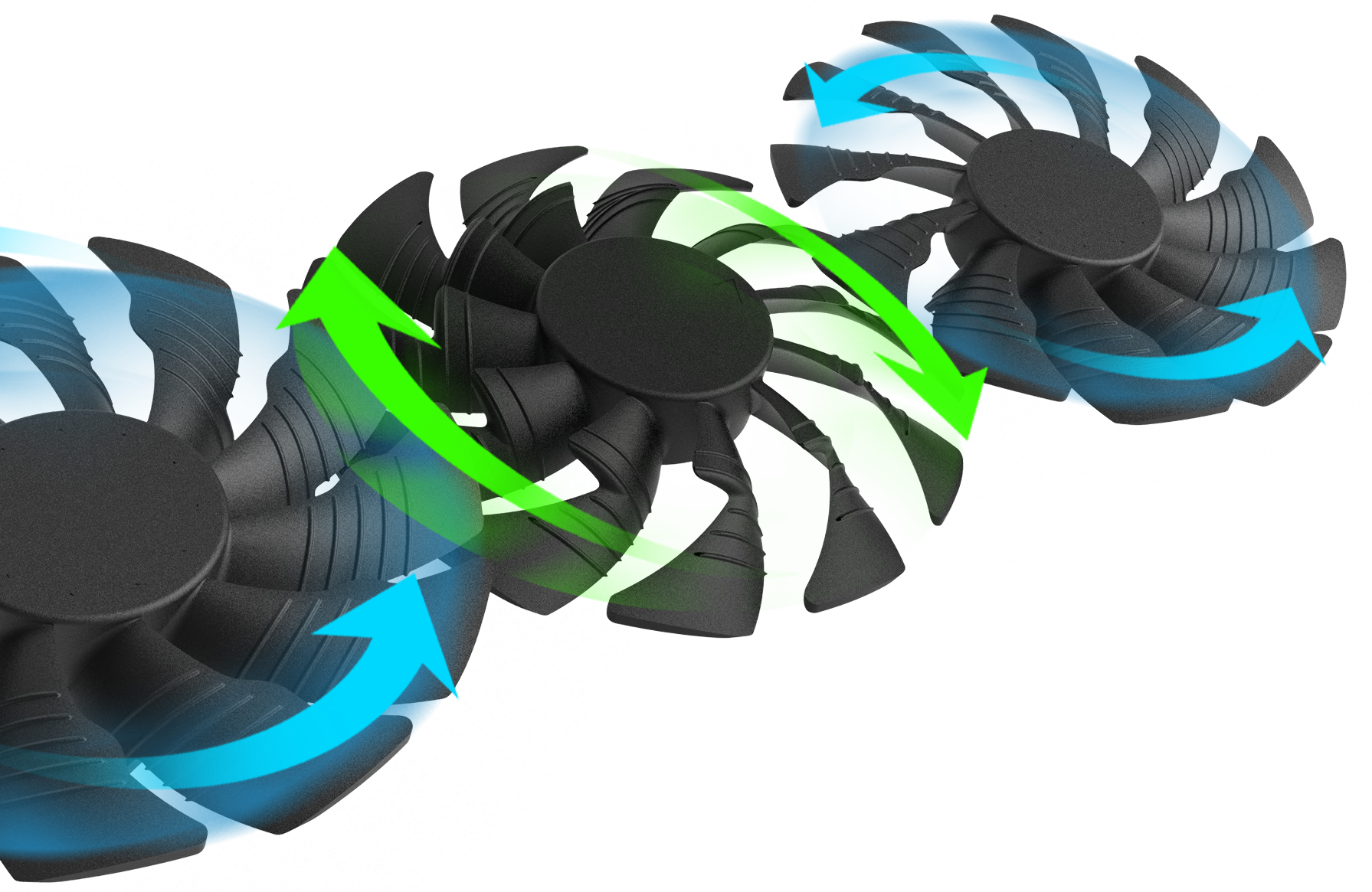 تقدم جيجابايت ابتكارها المتميز "اتجاه الدوران المتبادل للمراوح" و هو الحل الوحيد و الأمثل لمعالجة مشكلة تشتت تيار هواء التبريد عند استخدام ثلاث مراوح. حيث أن دوران الثلاث مراوح فى اتجاه واحد يؤدى إلى تعارض تيارات الهواء التى تنتجها كل مروحة و هو ما يسبب تشتت للتدفق المطلوب لتيار هواء التبريد و بالتالى انخفاض كفاءة التبريد. و لهذا قامت جيجابايت بتعديل اتجاه دوران المروحة الوسطى إلى اتجاه معاكس، الأمر الذى يجعل تيار الهواء الذى تنتجه المروحتين الجانبيتين يتدفق فى نفس الاتجاه. هذا الابتكار يقلل من تشتت تيار الهواء و يحسن تدفقه بشكل مثالى.
