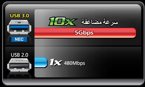 وحدة التحكم في USB 3.0 من شركة NEC ترفع سرعة نقل البيانات لعشرة أضعاف (10x) سرعة USB 2.0. وبالإضافة إلى هذه السرعة العالية، فإن USB 3.0 تتميز بأنها ثنائية الاتجاه حيث تسمح بنقل البيانات في نفس الوقت من وإلى جهاز الحاسب وأي جهاز متصل به عبر واجهة USB. بهذه السرعة المذهلة لنقل البيانات، فإن لوحات GIGABYTE الرئيسية التي تدعم USB 3.0 تعد مثالية للتعامل مع الأجهزة التي تدعم مواد الوسائط المتعددة عالية النقاء مثل الكاميرات الرقمية ووحدات العرض الرقمية وغيرها.