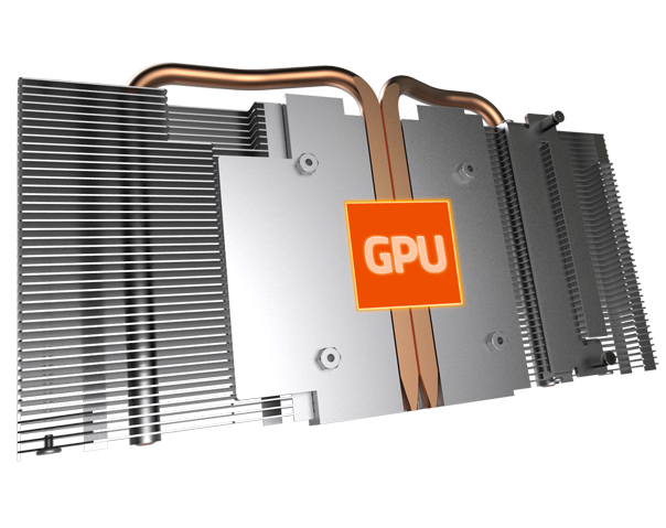Формата на изцяло медните топлоотводни тръби осигурява максимална повърхност за директен допир до графичния чип, подобрявайки преноса на топлина. Топлоотводната тръба покрива и модула VRAM чрез контакта с широката метална плоча, осигурявща правилно охладане.