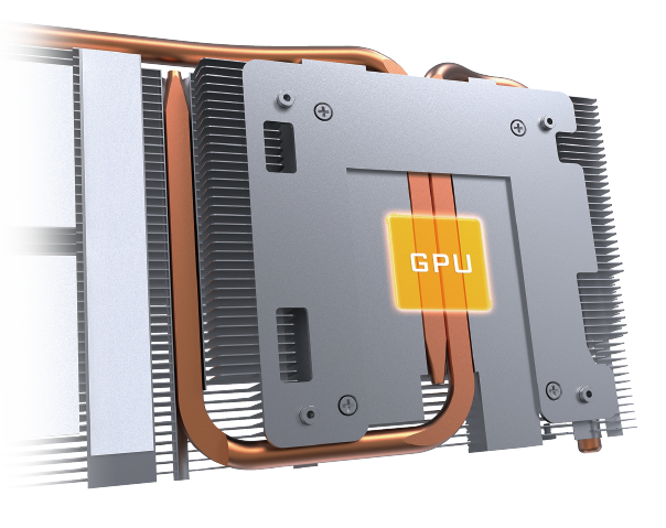 Формата на изцяло медните топлоотводни тръби осигурява максимална повърхност за директен допир до графичния чип, подобрявайки преноса на топлина. Топлоотводната тръба покрива и модула VRAM чрез контакта с широката метална плоча, осигурявща правилно охладане.