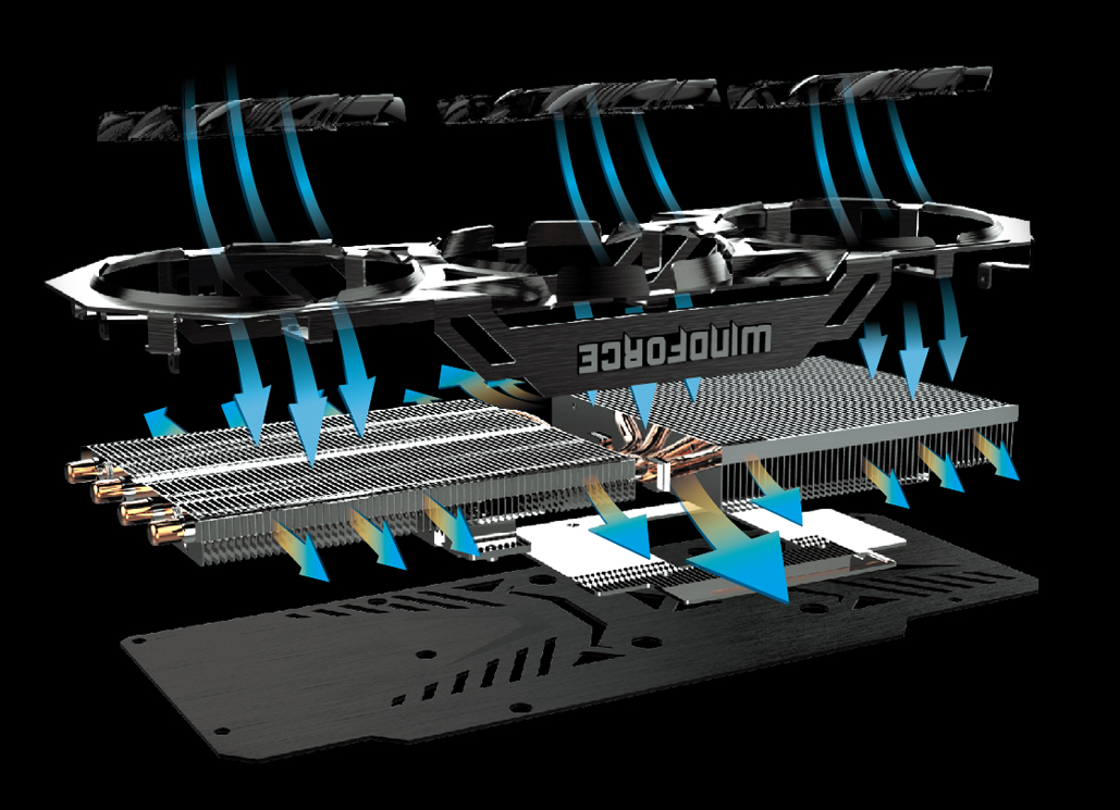 Охладителната система WINDFORCE 3X разполага с три уникални 80-милиметрови блейд вентилатори, 4 изцяло медни композитни топлоотводни тръби и топлоотвод с технология за директен допир. Всички те заедно осигуряват ефективен капацитет за разсейване на топлината за постигане на по-висока производителност при по-ниски температури.
