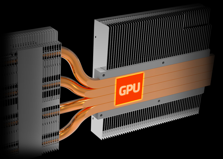 Изцяло медните топлоотводни тръби имат такава форма, че да се постигне максимална контактна повърхност с графичния чип GPU.