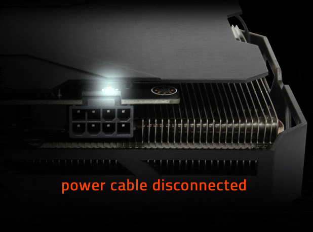 Полупасивните вентилатори ще останат изключени, когато графичният чип GPU е под определено ниво на натоварване или на температурата за игри, изискващи по-малко енергия. LED индикаторът на вентилатора, разположен в горната част на графичната карта предоставя моментална информация за състоянието на вентилатора.