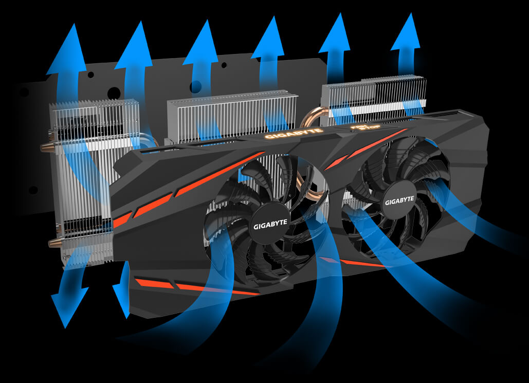 Охладителната система WINDFORCE 2X разполага с два 90-милимтрови уникални блейд вентилатори, 2 медни композитни топлоотводни тръби, дизайн с алтернативно въртящи се вентилатори и топлоотводи с технология за директен допит, като всички те заедно предоставят ефективен капацитет за разсейване на топлината за по-голяма производителност при по-ниски температури.
