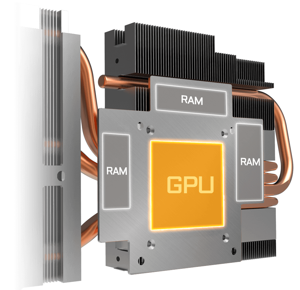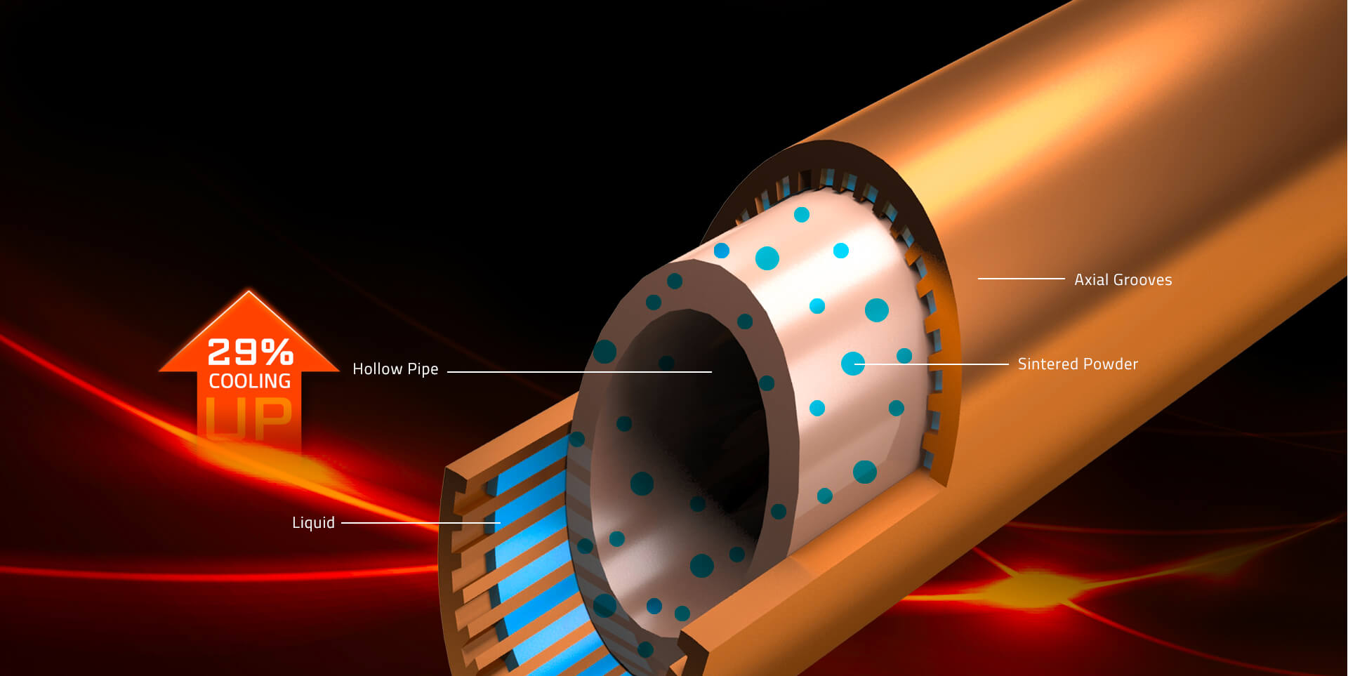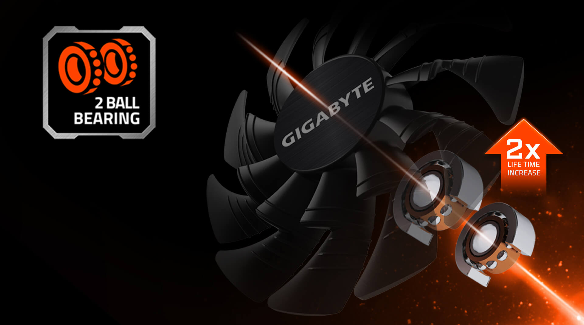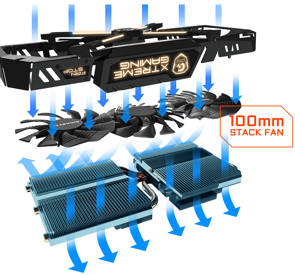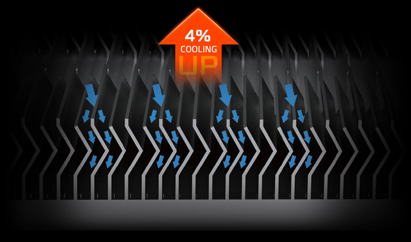 Трите групирани 100-мм вентилатори предоставят по-голям и по-плавен въздушен поток. А чрез по-голямото покритие на радиатора в сравнение с три 80-мм вентилатора, групата от вентилатори WINDFORCE ще има с 10% по-добра охладителна производителност.