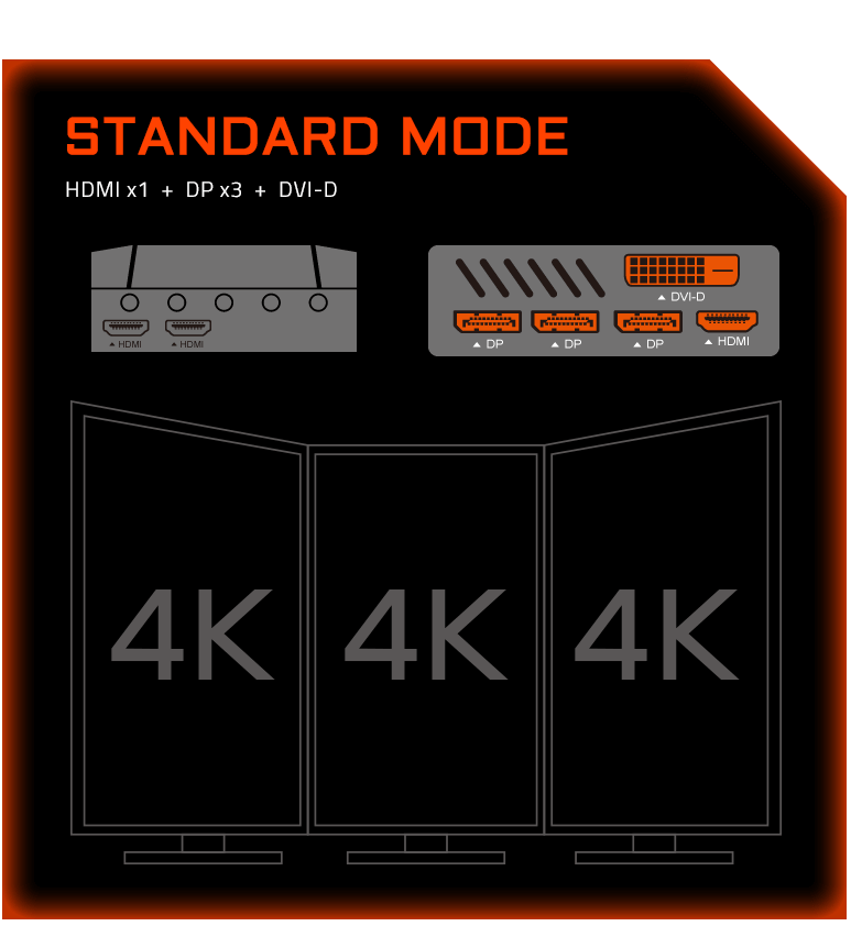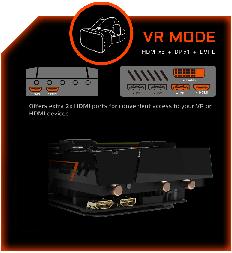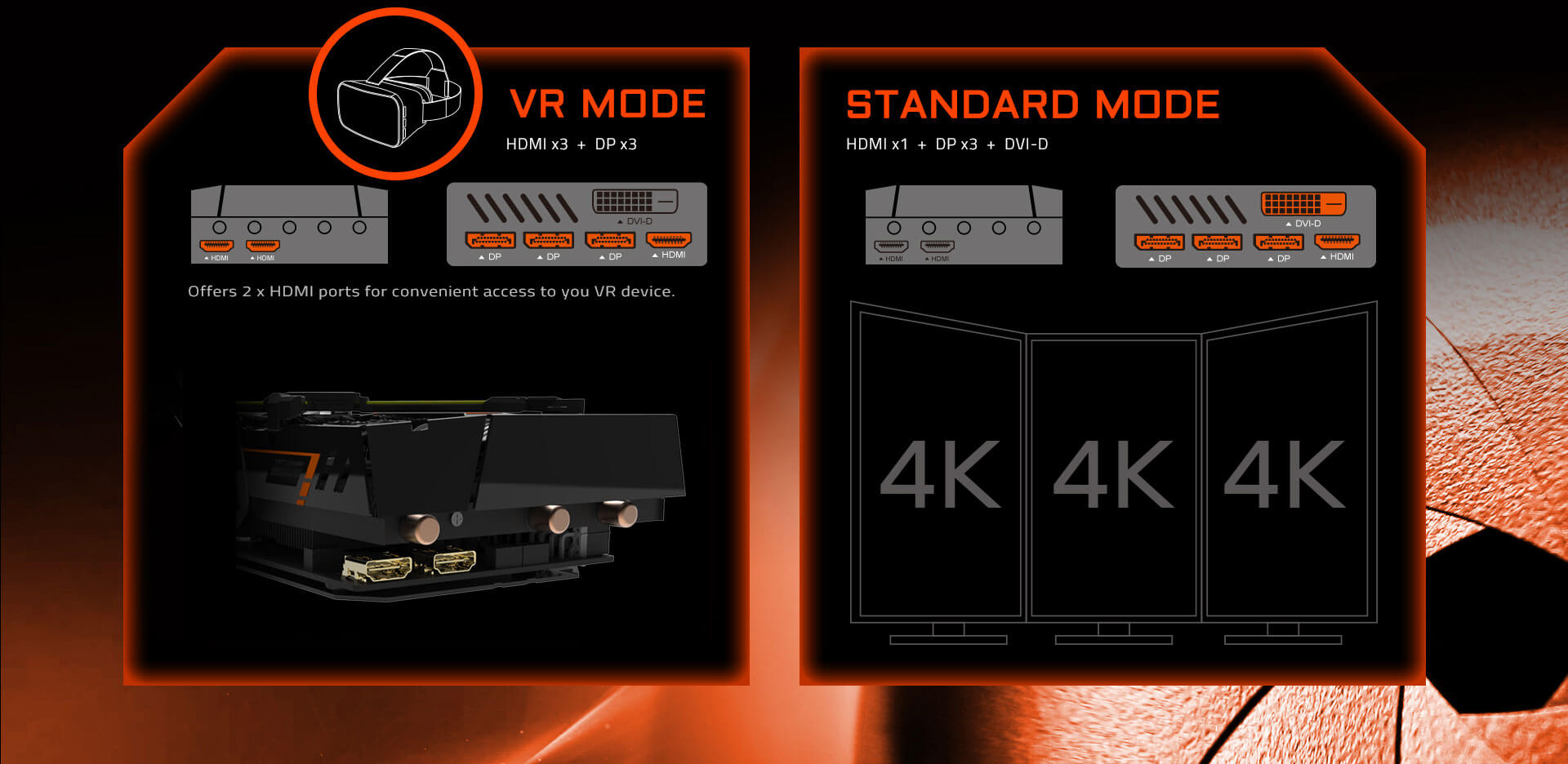 С 2 допълнителни порта HDMI, Xtreme VR Link иновативно предоставя още по-гъвкава свързаност за външни устройства. Свържете до 4 монитора и/или VR устройства едновременно с общо 3 порта DisplayPort и 3 вградени порта HDMI, като всички те могат да се използват взаимозаменяемо в режим VR за всички типове геймърски конфигурации. Изводите се разпознават автоматично при рестариране на компютъра, без да има нужда от допълнителна настройка.