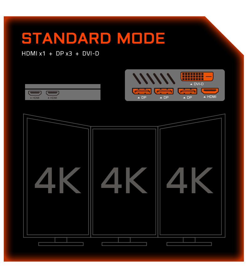 Xtreme VR Link provides the best solution for both VR device demand with 3 HDMI ports and 3x 4k monitors demand with 3 DP ports. Outputs are automatically detected when restarting PC.