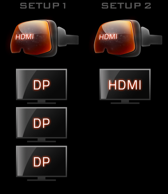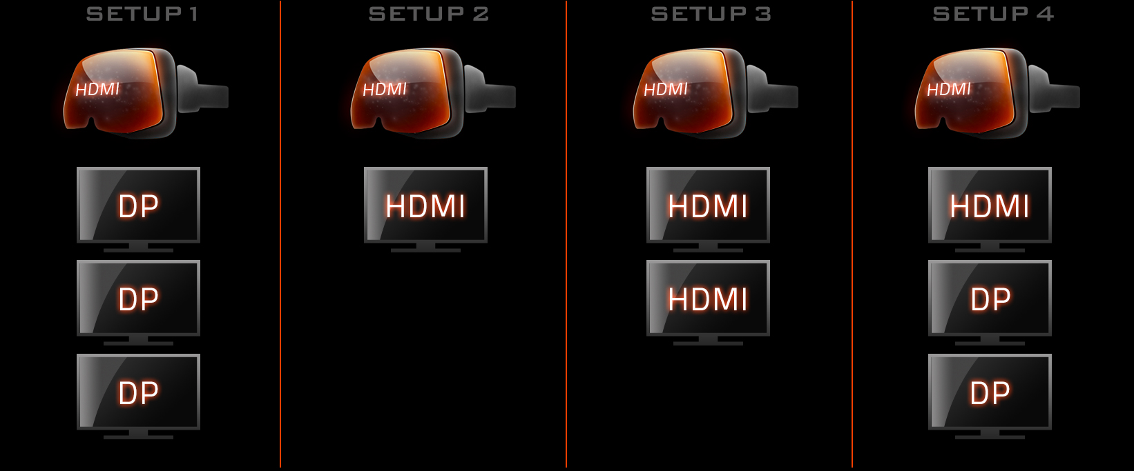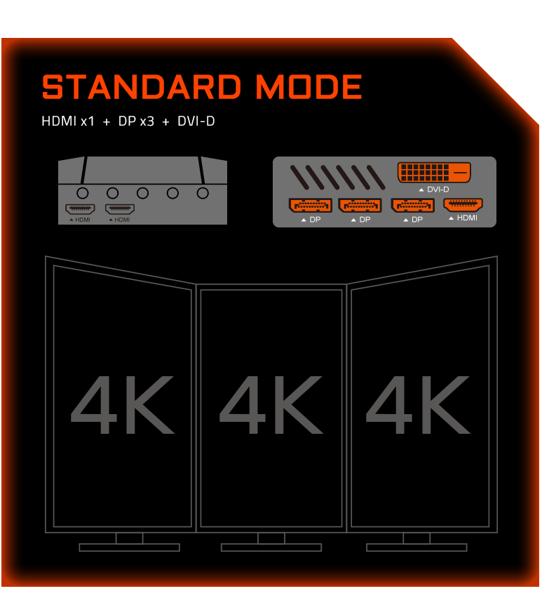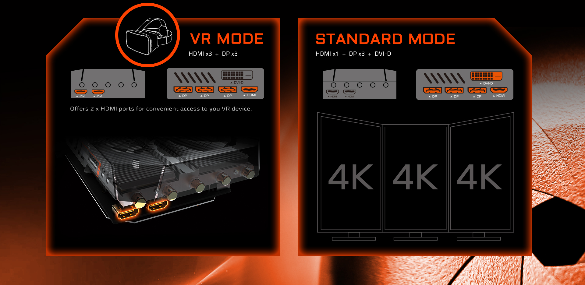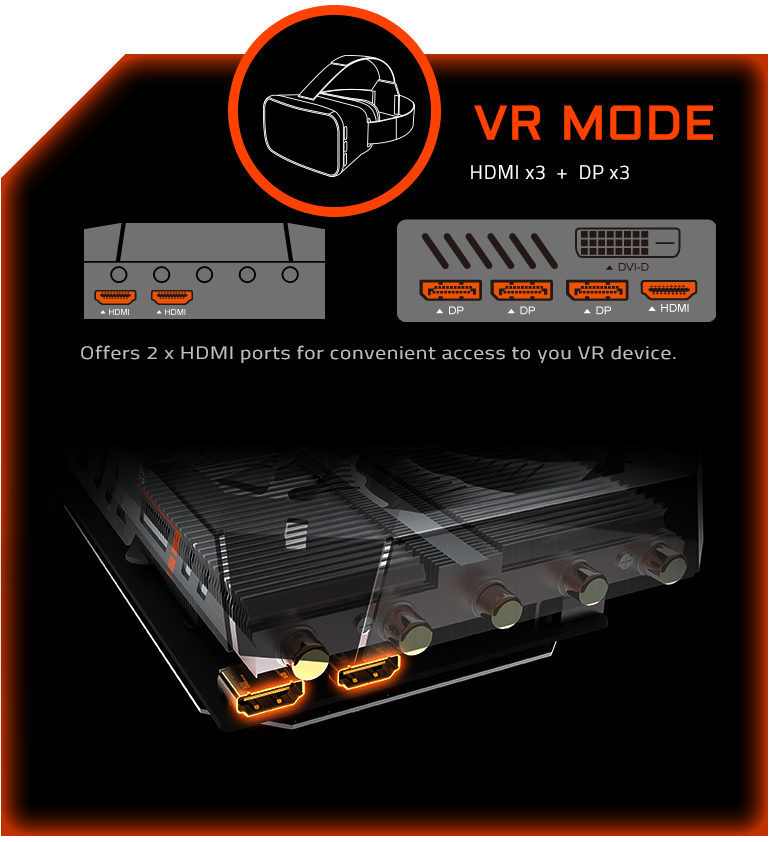 With 2 extra HDMI ports, Xtreme VR Link innovatively provides the most flexible output connectivity. Connect up to 4 monitors and/or VR devices at the same time with a total of 3 DisplayPort and 3 native HDMI ports that could be used interchangeably under VR Mode for all types of gaming configuration. Outputs are automatically detected upon restarting PC with no further setting required.