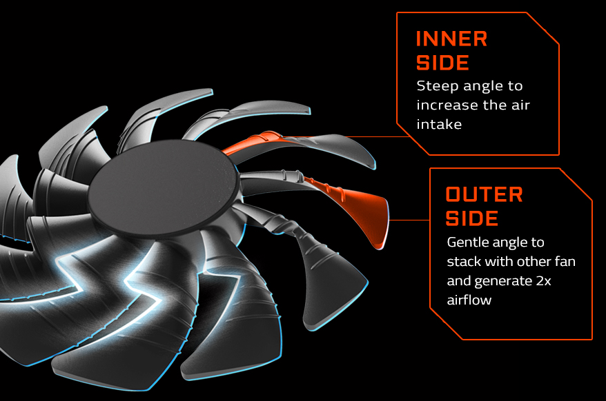 The middle fan spins in the reverse direction to optimize the airflow to dissipate the heat more effective for accomplishing higher performance at a lower temperature.
