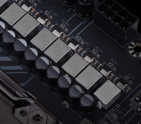 As placas-mãe AORUS integram capacitores sólidos de melhor qualidade e garantem a entrega de máxima eficiência em longos períodos, mesmo em configurações de extrema performance. Com uma baixa taxa de ESR e independente da carga da CPU, o usuário pode ficar tranquilo para exigir o máximo de seu sistema com segurança e estabilidade. Estes capacitores também são personalizados na cor preta, exclusividade das placas-mãe AORUS.
