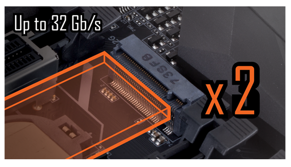 Com dois conectores NVMe PCIe Gen3 x4 M.2 onboard, a AORUS traz para o usuário conectividade PCI-Express para dispositivos SSD. Dando uma velocidade de transferência de dados de até 32 Gb/s por conector, o M.2 duplo oferece uma solução de armazenamento ideal, pois também suporta modos RAID.
