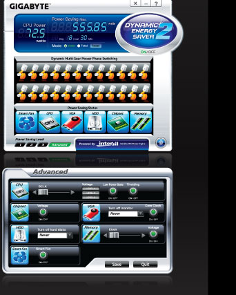 GIGABYTE Dynamic Energy Saver™ 2 incorporates a host of intelligent features that use a proprietary hardware and software design to considerably enhance PC system energy efficiency, reduce power consumption and deliver optimized auto-phase-switching for the CPU, Memory, Chipset, VGA, HDD and system fans with a simple click of a button. |