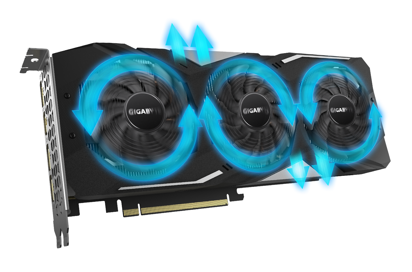 Notre technologie est la seule solution permettant de minimiser les turbulences générées par les 3 ventilateurs embarqués. Si les 3 ventilateurs tournaient dans la même direction, d'importantes turbulences viendraient réduire l'efficacité du flux d'air, dont l'objectif principal est de dissiper la chaleur émise. Le second ventilateur de votre carte graphique tourne dans le sens contraire afin de réduire ces turbulences et d'assurer une bonne circulation de l'air en toute circonstance.