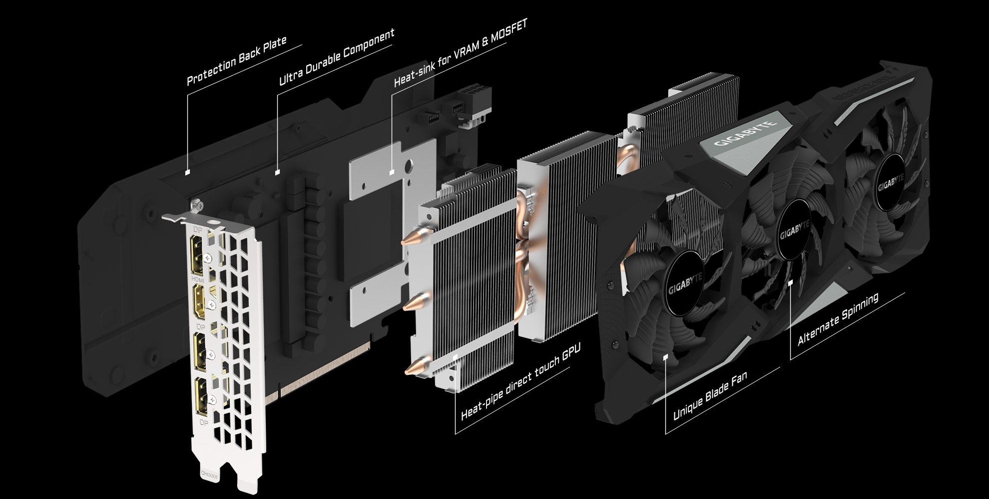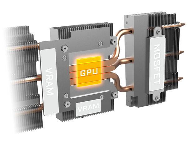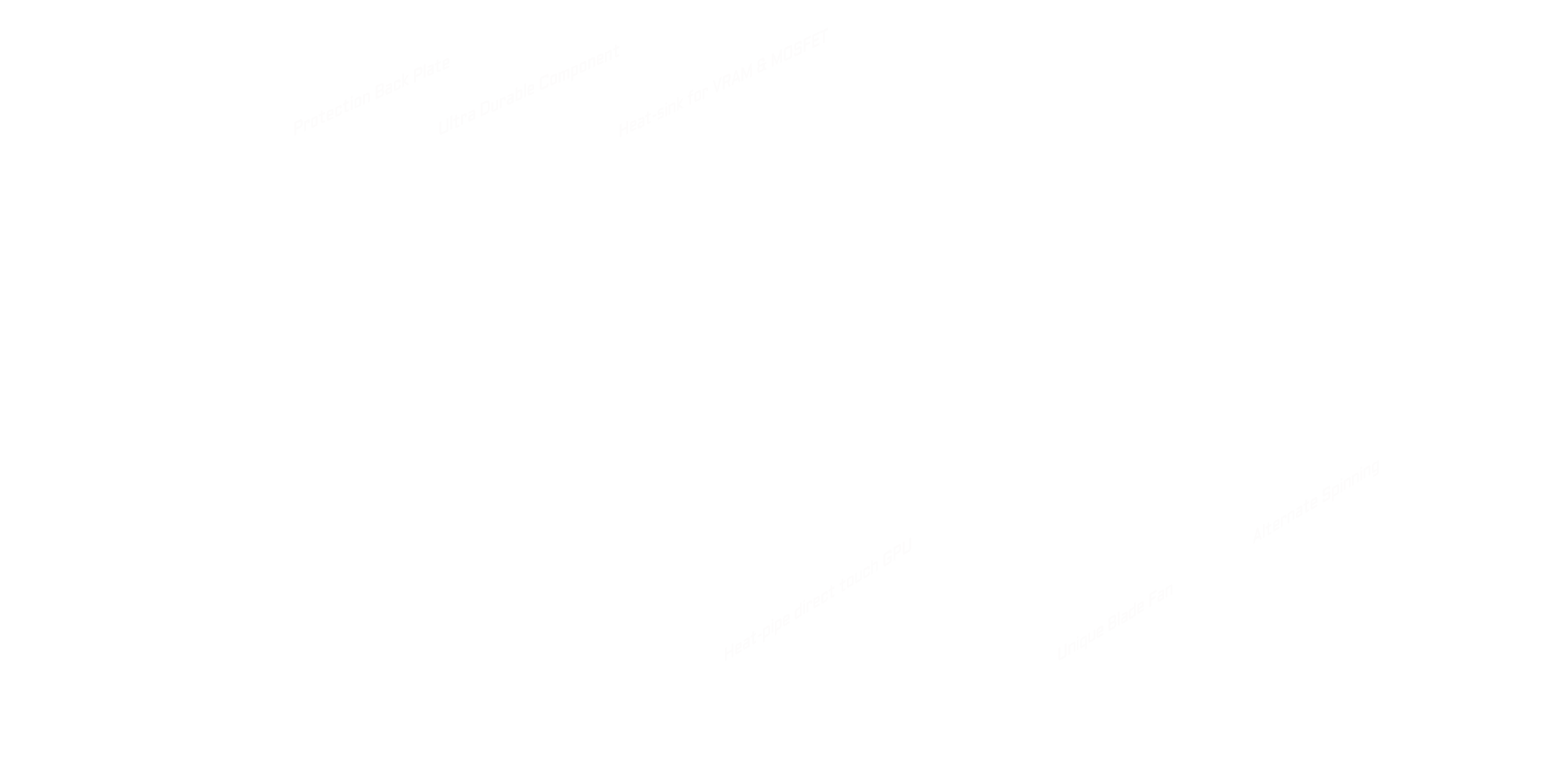 Le système de refroidissement WINDFORCE 3X associe 3 ventilateurs 80mm à rotation alternée, 3 caloducs en cuivre, caloduc direct touch et fonctionnalité 3D Active Fan pour une dissipation optimisée de la chaleur et des températures toujours sous contrôle.