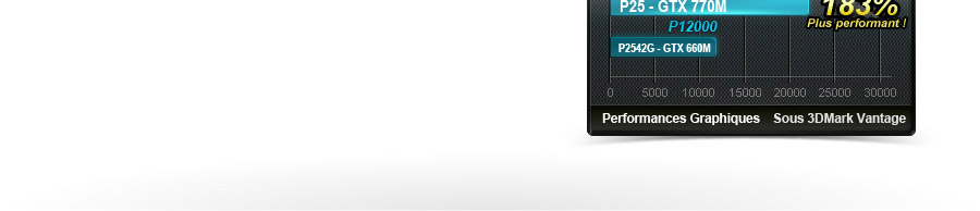 Embarquant une puce graphique NVIDIA® GeForce® GTX 770M GDDR5 3Go compatible avec les technologies NVIDIA® Optimus™, NVIDIA® PhysX™ et DirectX11, le P25W se positionne comme la plateforme de référence pour joueurs exigeants, avec des scores de 22 000 points sous 3DMark Vantage!
