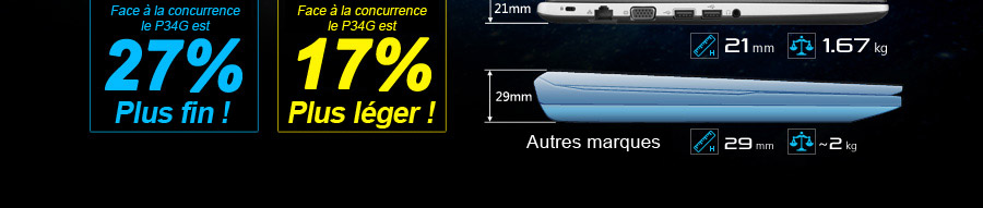 Le P34G est capable d'embarquer 1 disque SSD mSATA 256Go ainsi qu'un disque dur 1To ! Ce double système hybride offre hautes performances et grande capacité de stockage pour que vous puissiez gérer, sans limites ni contraintes, la totalité de vos fichiers professionnels ou personnels.