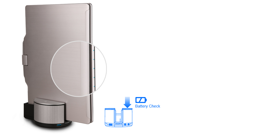 The docking station supports innovative quick battery status check. This function lets you see how much battery power is remaining when the laptop is off. Simply click on the battery check button on the docking and the LED lights will light up to indicate how much battery power is remaining.