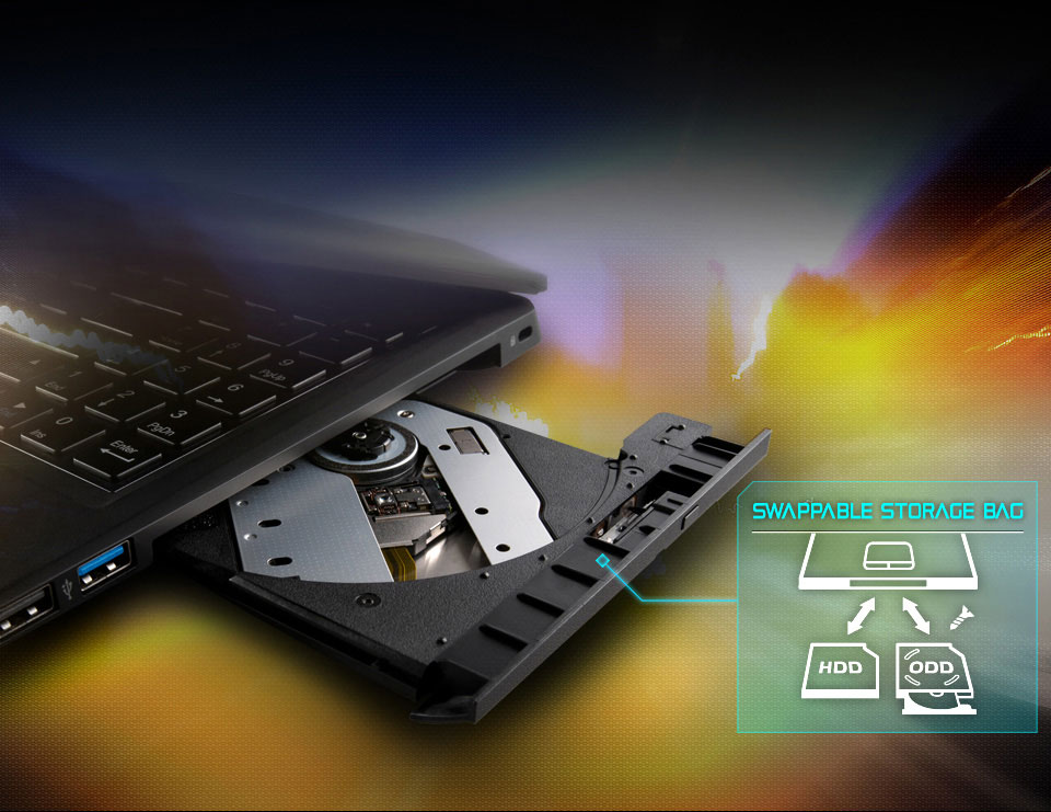 Le P15F V2 propose un compartiment amovible pouvant accueillir soit un lecteur DVD soit un disque dur. Cette innovation est particulièrement intéressante pour un joueur souhaitant customiser sa configuration en fonction de ses besoins, et bénéficier le cas échéant, d'une configuration ultra-légère si aucun périphérique n'est inséré.