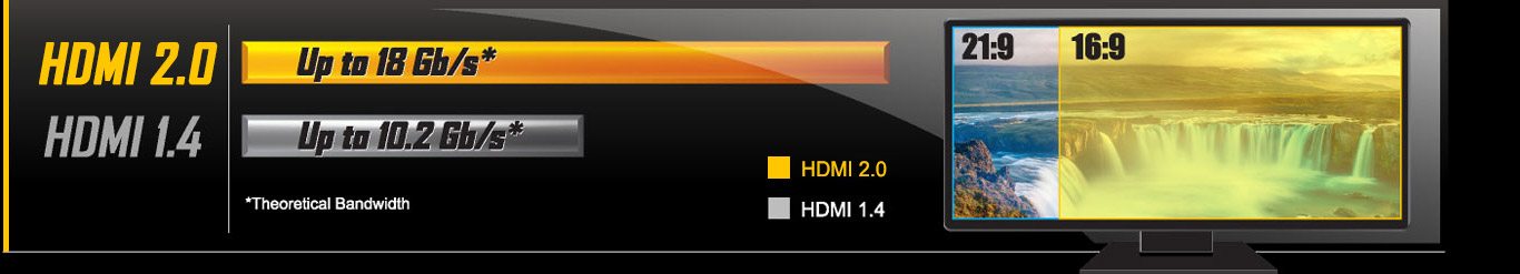 HDMI™ is a High-Definition Multimedia Interface which provides up to 5Gb/s video transmitting bandwidth and 8-channel high quality audio all through a single cable. Able to transmit superior, uncompressed digital video and audio, HDMI™ ensures the crispest rendering of digital content up to 1080p without the quality losses associated with analog interfaces and their digital-to-analog conversion. In addition, HDMI™ is compatible with HDCP (High-bandwidth Digital Content Protection), allowing the playback of Blu-ray/HD DVD and other protected media content.