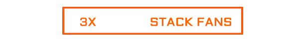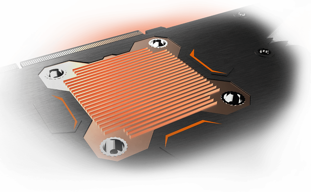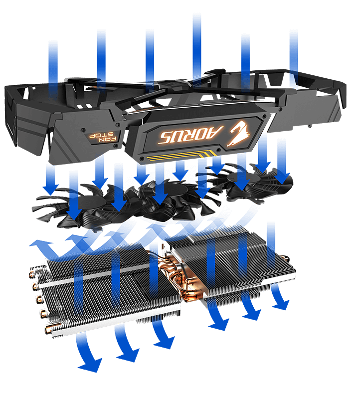 A 3x 100 mm-es, egymásra rétegzett, lapolt ventilátorok nagyobb légszállítást biztosítanak. Annak köszönhetően, hogy nagyobb részét lefedik a bordának, mint a 3x 80 mm-es ventilátorok, a WINDFORCE rétegzett ventilátorok 10%-kal javítják a hűtés hatékonyságát.