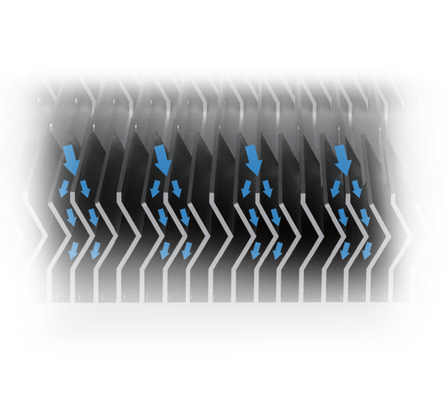 A speciális kialakítású, nem egyenes lamellák nagyobb felületen disszipálják a hőt, emellett megfelelően vezetik a légáramlatot, alacsonyabb zajszintet és jobb hűtési teljesítményt garantálnak.