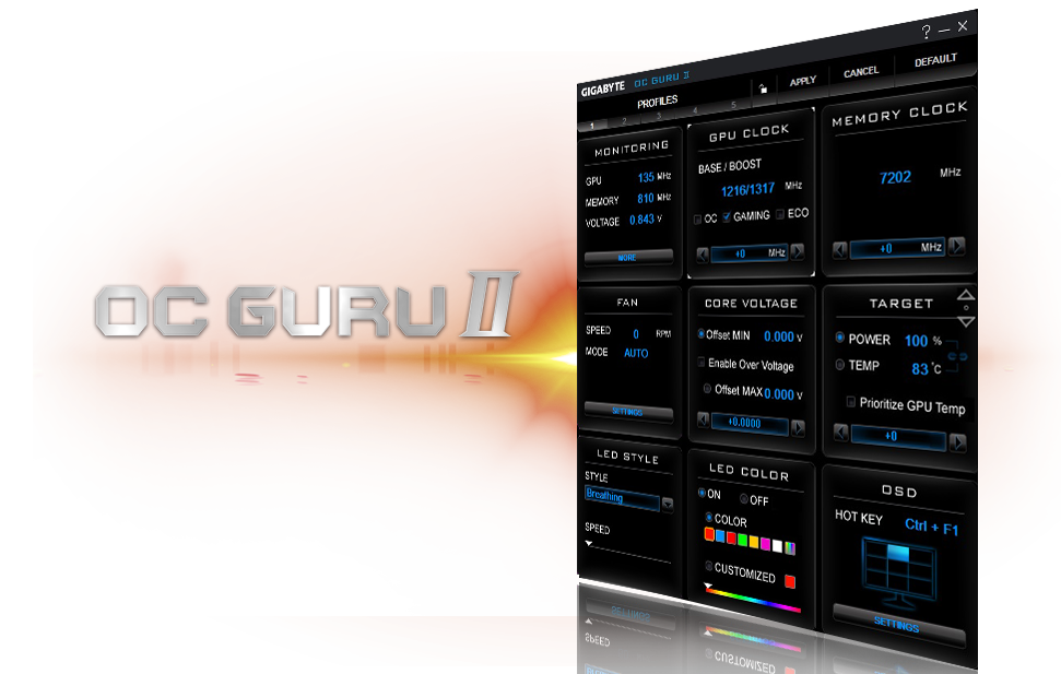 Brand-new intuitive user interface helps you easily modify important settings and directly update driver and BIOS. Clock speeds, voltage, fan performance, and OSD setting can be monitored and tuned in real-time according to your own preference.