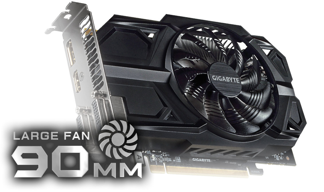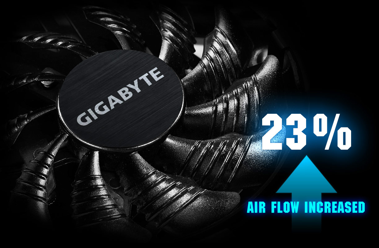 GIGABYTE custom-designed 90 mm cooler, with air flow optimized cover and aluminum base. The cooler can dissipate heat effectively from the GPU while keeping the fan at lower speed and noise.