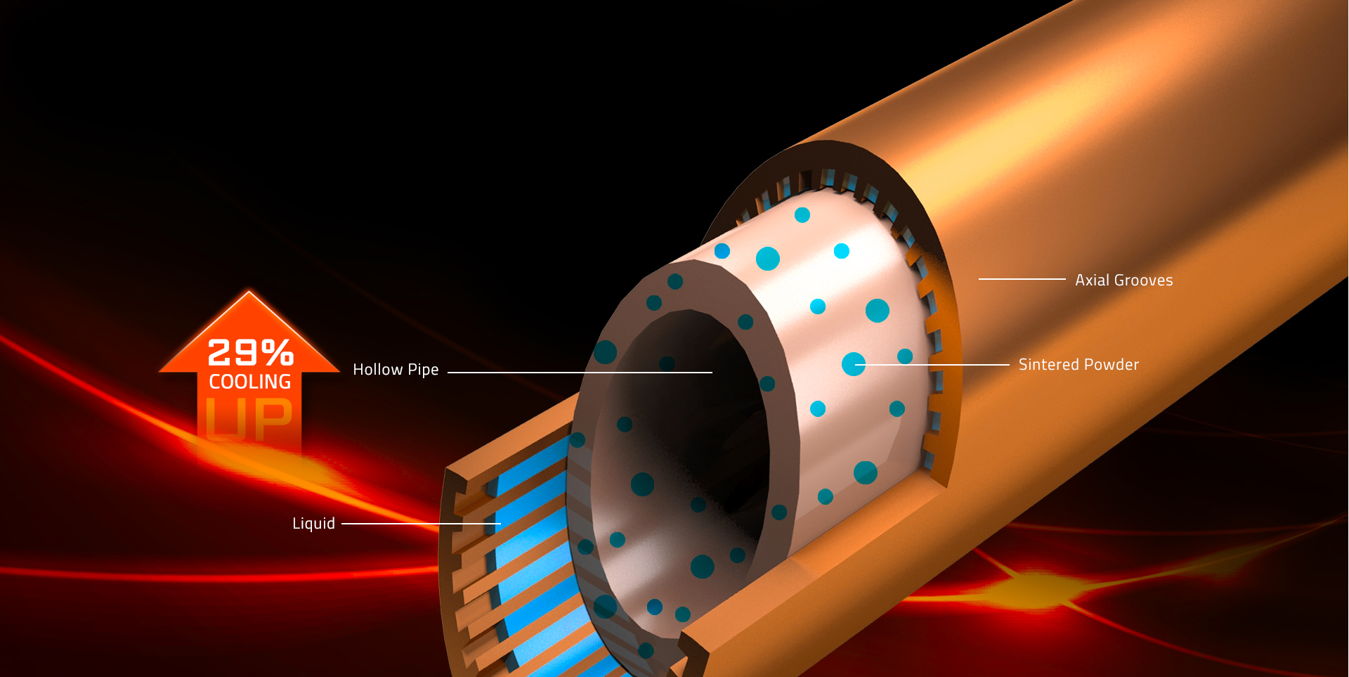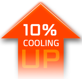The angular and unequal fins height does not only channel the airflow through the fins and enlarge the contact surface but also results in a lower noise level and better cooling capacity.