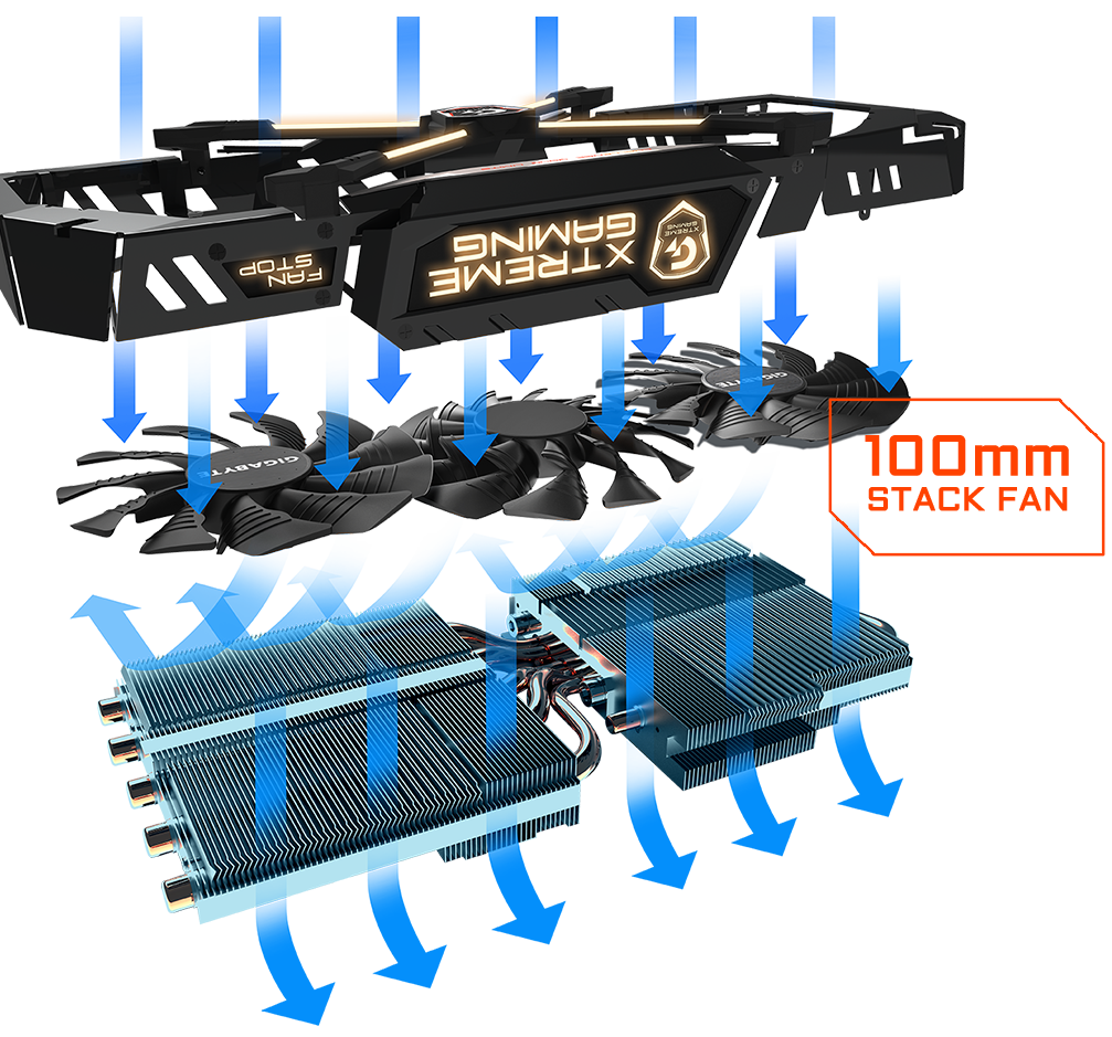 The 3x 100mm stack fans provide larger and more smooth airflow. And with more heatsink coverage than 3x 80mm fans, WINDFORCE stack fans will have 10% better cooling performance.