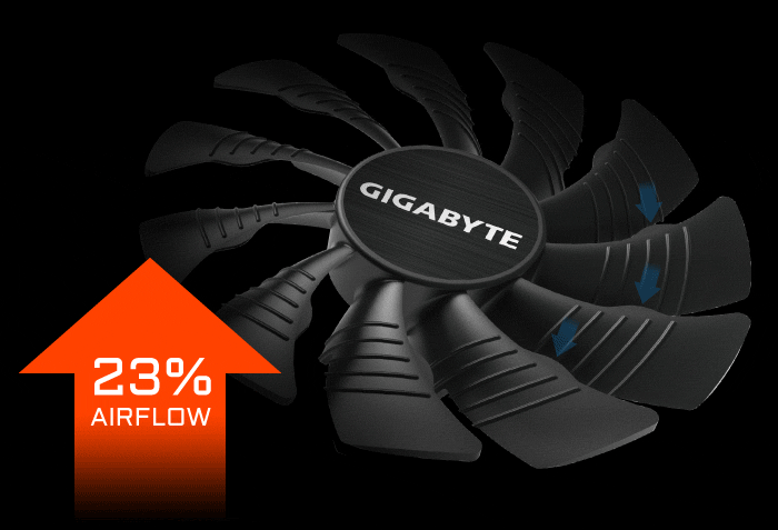The airflow is spilt by the triangle fan edge, and guided smoothly through the 3D stripe curve on the fan surface, effectively enhancing the air flow by 23% over traditional fans.