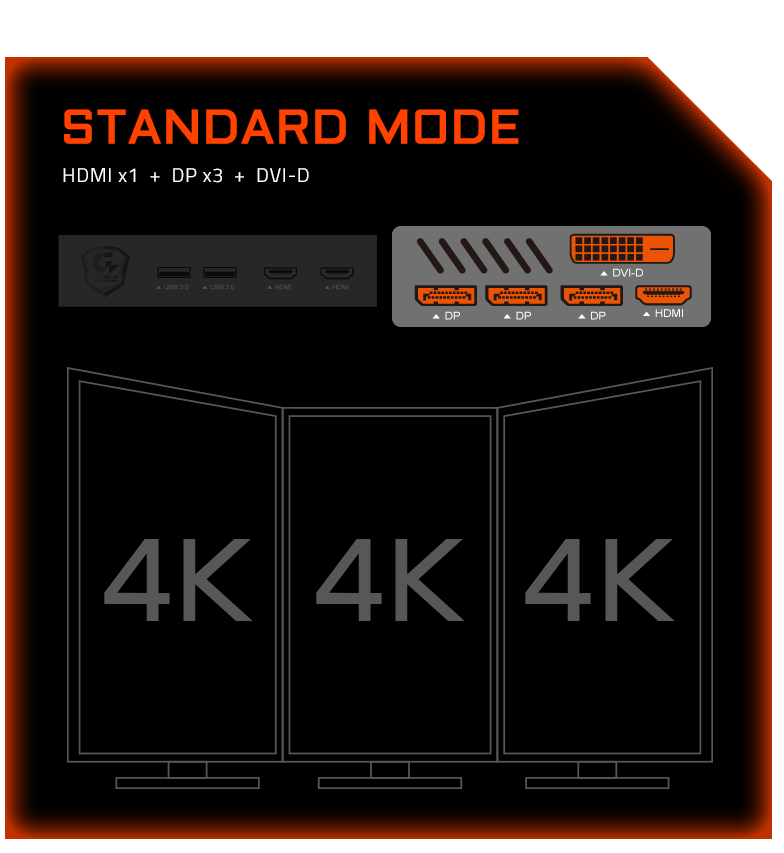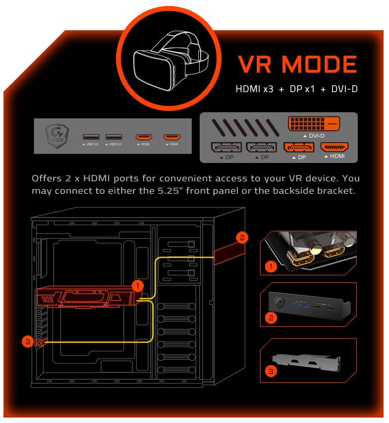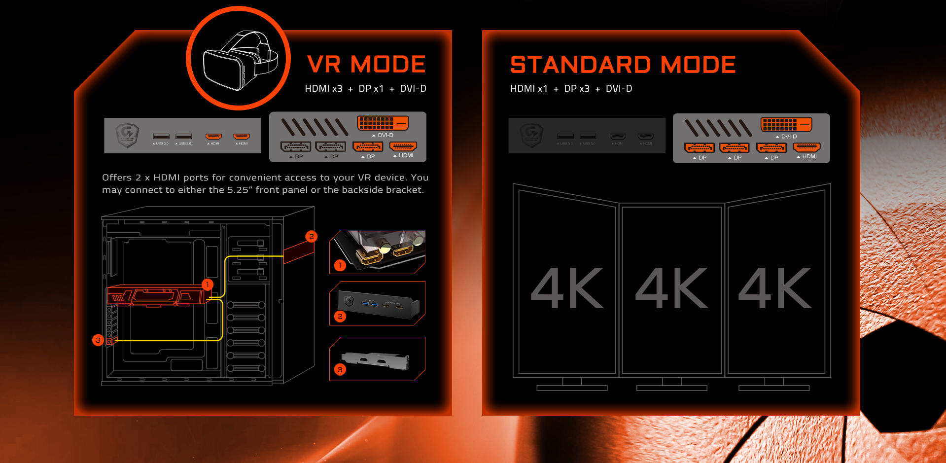 Xtreme VR Link provides the best solution for both VR device demand with 3 HDMI ports and 3x 4k monitors demand with 3 DP ports. Outputs are automatically detected when restarting PC.