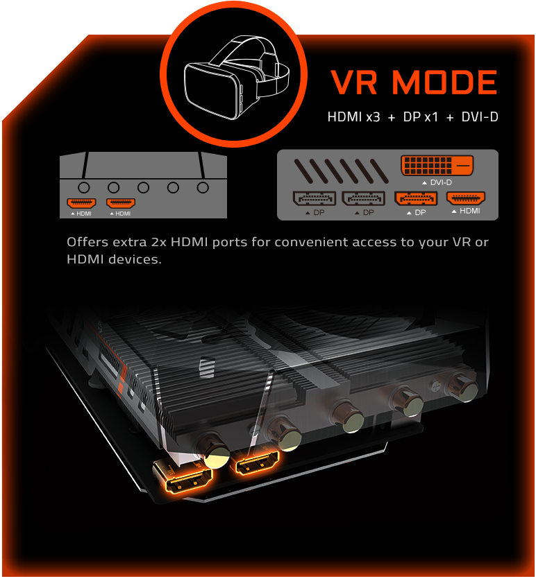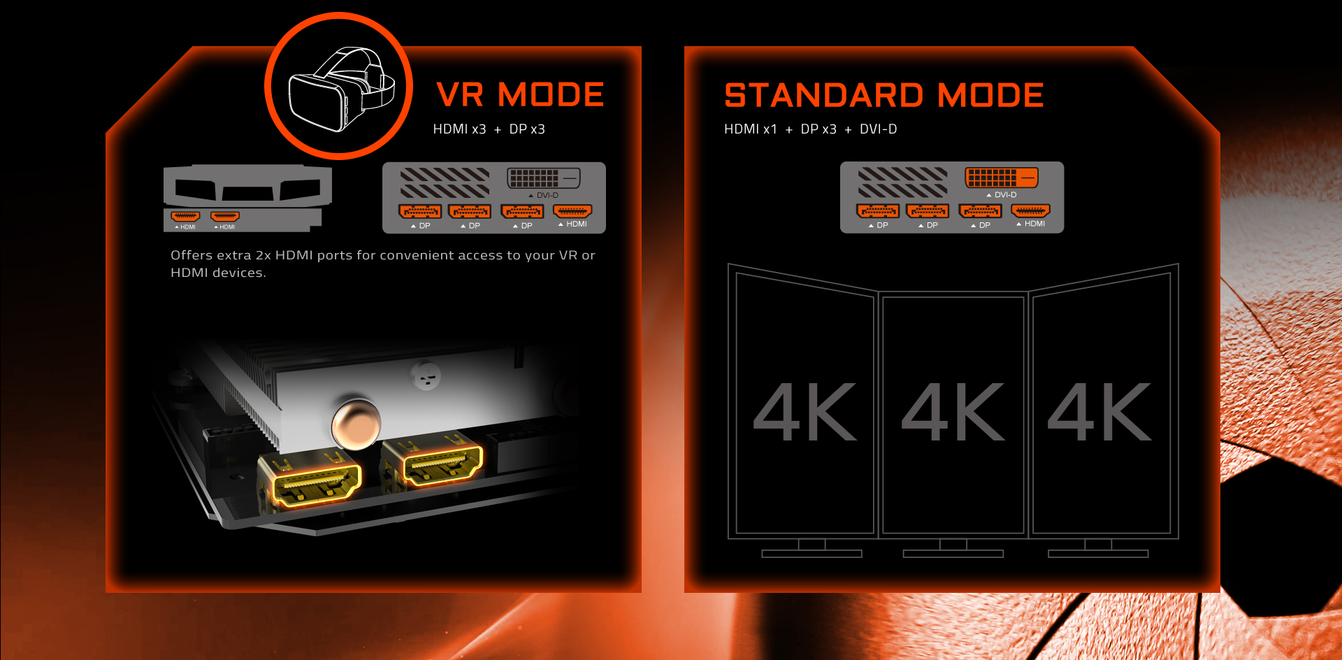 Xtreme VR Link不但可以滿足在一般模式下,使用3個DP接頭享受4K遊戲體驗的玩家,技嘉科技更是獨創VR模式,提供3個原生HDMI接頭並保留原本3個DP接頭,讓已經使用HDMI接頭作為螢幕使用的玩家,可以有多的原生HDMI接頭來連接VR設備,不需要再透過轉接頭來使用。VR模式提供3個HDMI與3個DP輸出,可以任選4個輸出支援4個不同的畫面顯示,讓消費者不用煩惱要用HDMI或DP來接螢幕,省去使用轉接頭的困擾。依照如圖的連接方式,於重新開機後,顯卡會自動偵測與切換到對應的模式,完全不需要額外的設定。