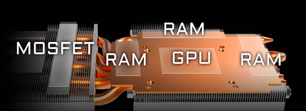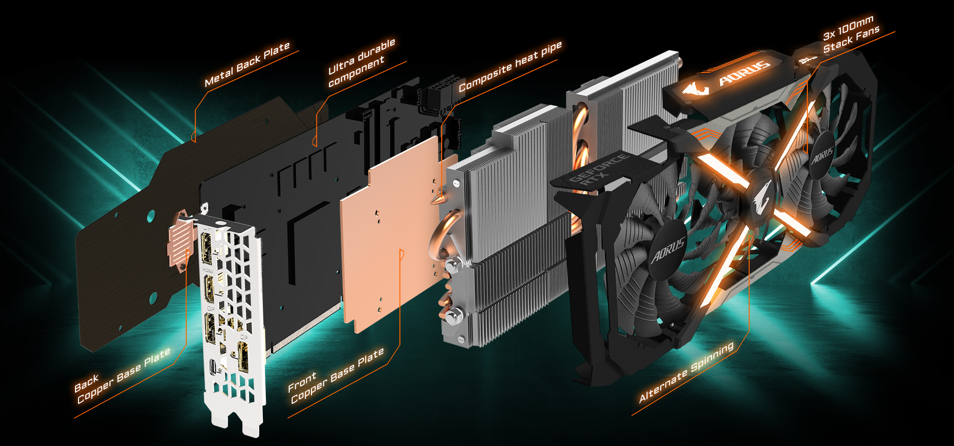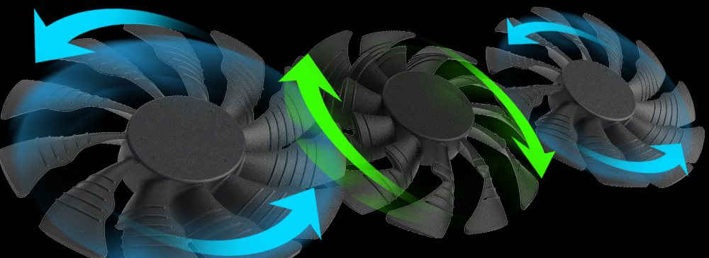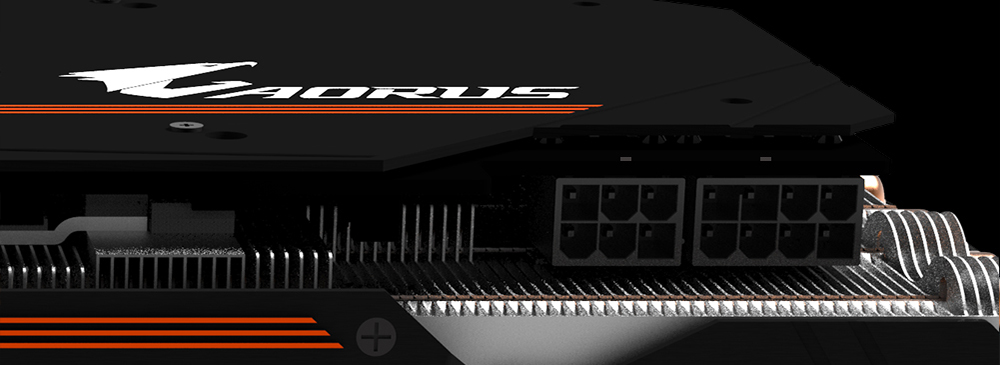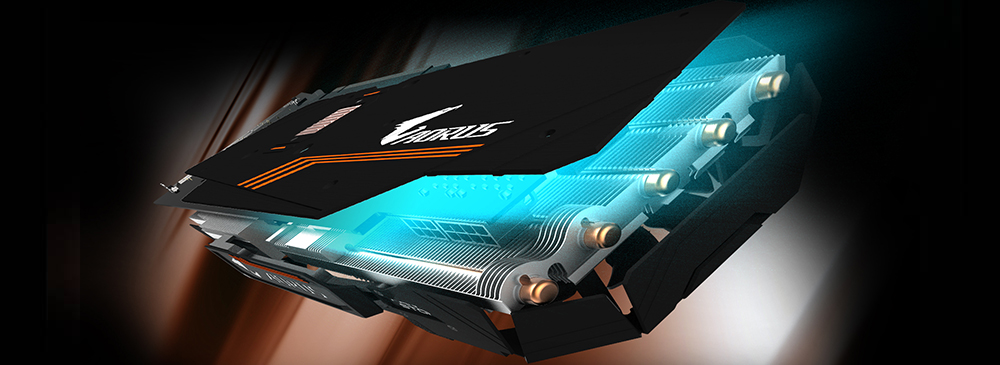AORUS의 전방위 쿨링 솔루션은 그래픽카드의 핵심 컴포넌트를 고려했다. GPU 뿐만 아니라 VRAM, MOSFET 및 기타 발열 컴포넌트 모두 쿨링 솔루션에 의해 보호되어, 모든 컴포넌트가 안정적으로 고성능을 발휘, 사용 수명이 연장되었다. GIGABYTE의 특허 받은 WINDFORCE STACK 3x 100mm 쿨링 시스템은 바람의 방향이 충돌하지 않게 설계하여 쿨링 성능을 크게 향상시켰다. 항상 그래픽카드를 저온 작업 환경에 둘 수 있을 뿐만아니라 제품의 고성능 및 안정성을 제고했다.