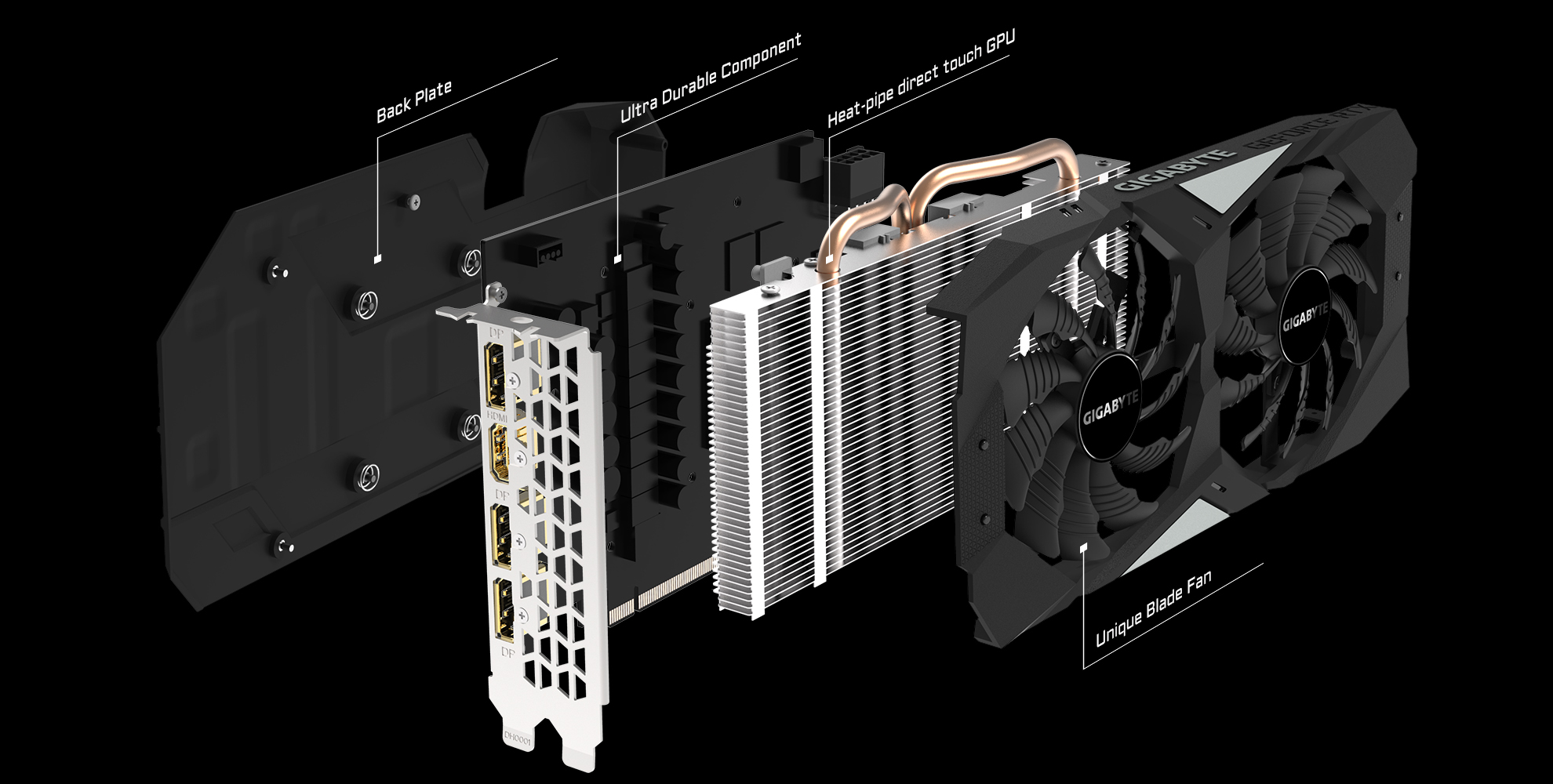 고성능 구리 히트 파이프를 납작하게 만들어 GPU 표면에 최대한 직접 닿게 하여 히트 파이프와 GPU의 직접 접촉 면적을 늘림으로써 GPU의 열 전도 를 크게 개선했으며 또한 VRAM 위를 덮은 금속판을 통해 구리 히트 파이프가 다른 중요한 컴포넌트의 쿨링을 적절하게 도와주고 있다. 이와 같은 쿨링 시스템에 힘입어 그래픽카드는 항상 저온의 작동 환경을 유지할 수 있다.