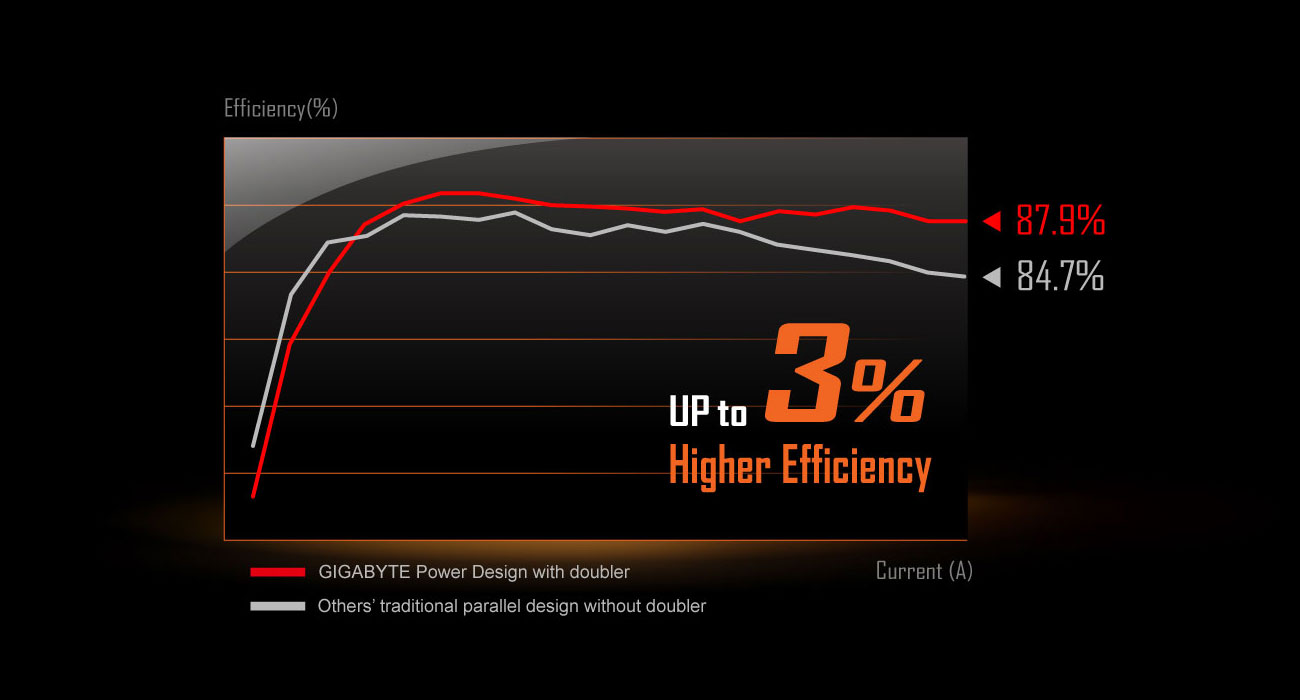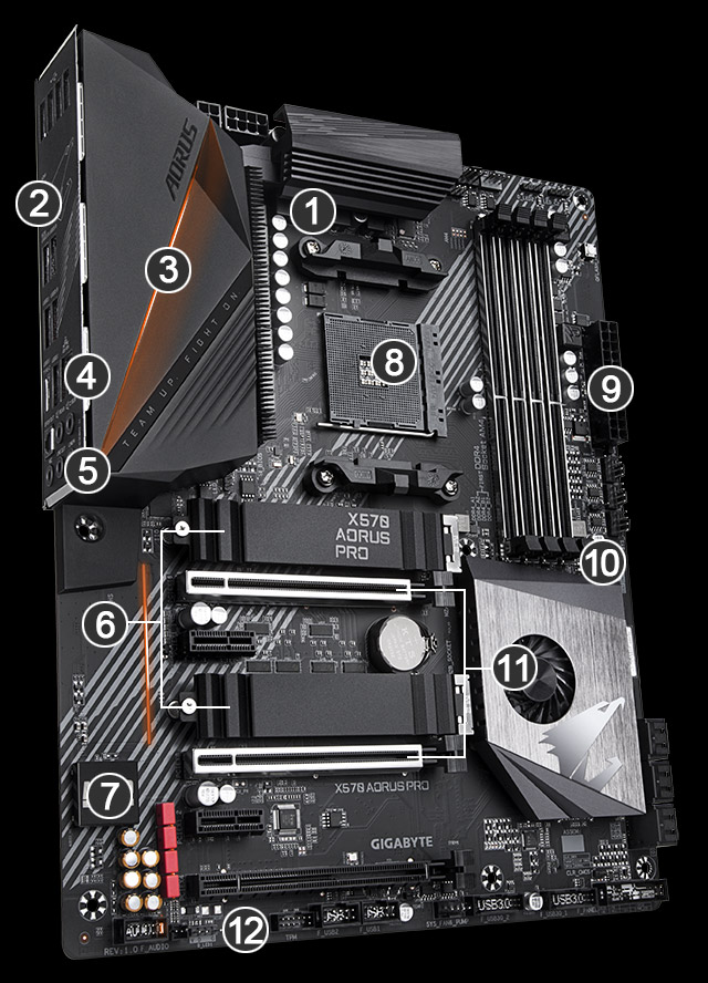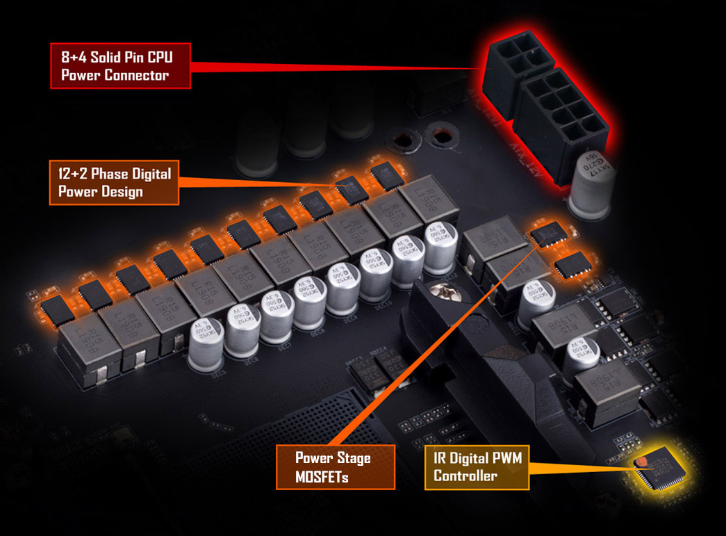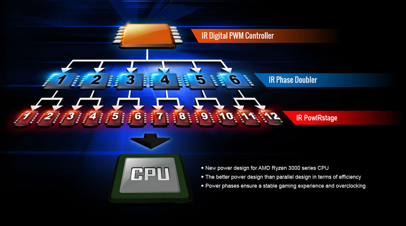 X570 AORUS PRO motherboard uses an all IR digital CPU power design which includes both digital PWM Controller and Power Stage MOSFET, and is capable of providing a total of 480A.