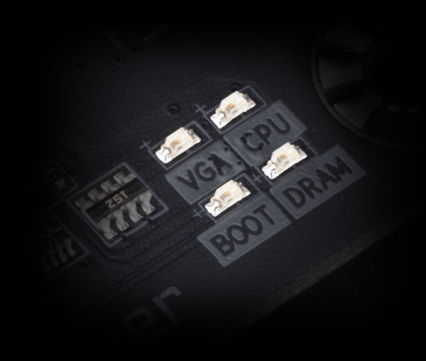 Onboard LEDs controlled by the system BIOS indicate if a malfunction is occurring, allowing users to quickly diagnose which major component (CPU/DDR/VGA/HDD) is malfunctioning so they may take action promptly.
