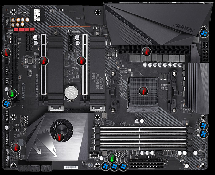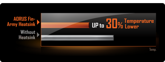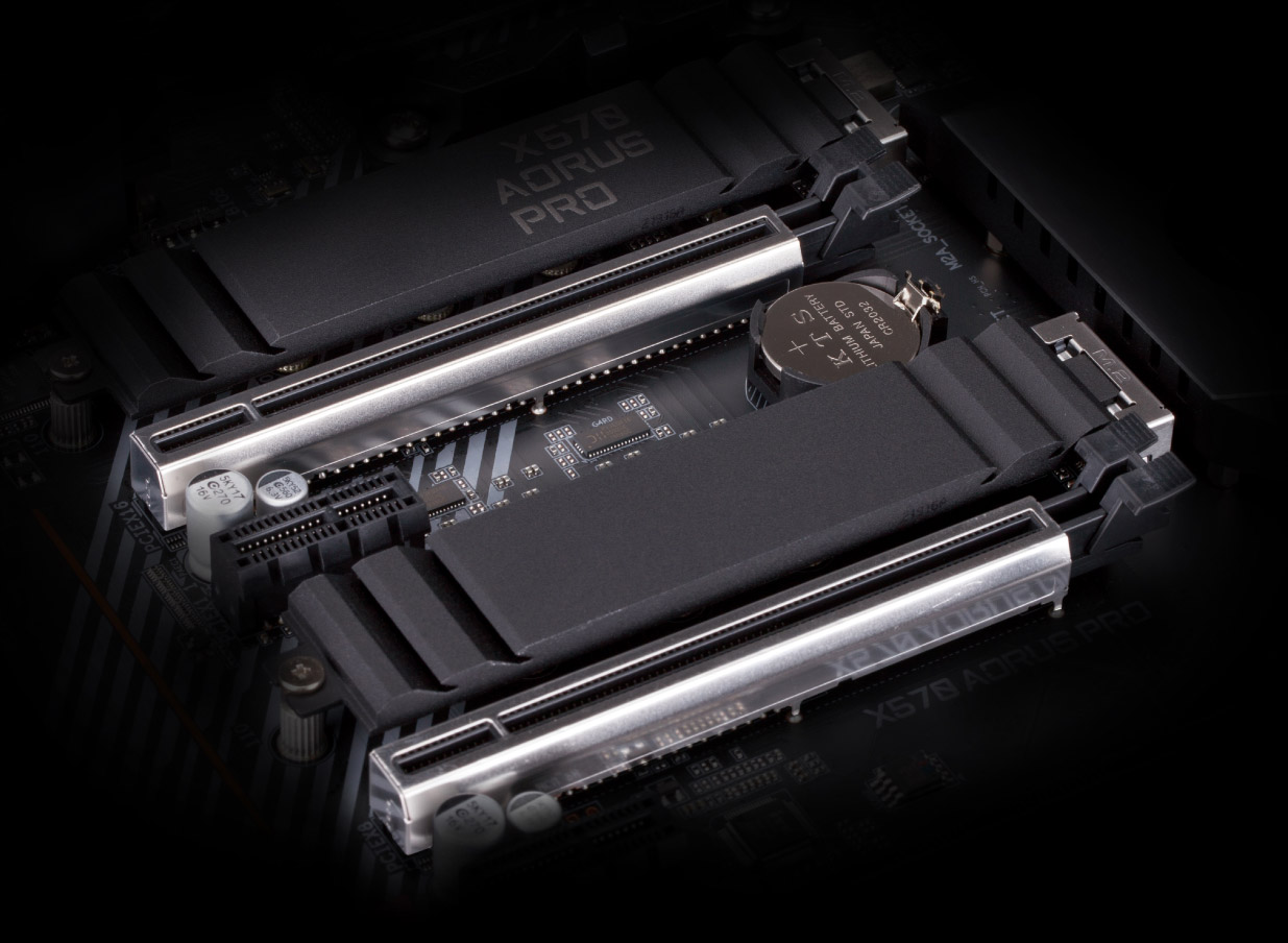 X570 AORUS PRO uses Fins-Array Heatsink which increases the heat dissipation area by 300% compared to traditional heatsinks of the same size. Direct Touch Heatpipe helps transfer heat from MOS fins. By using LAIRD 1.5mm thick, 5W/mK high thermal conductivity pads, it can transfer 2.7x more heat compared to traditional thermal pads in the same time period.