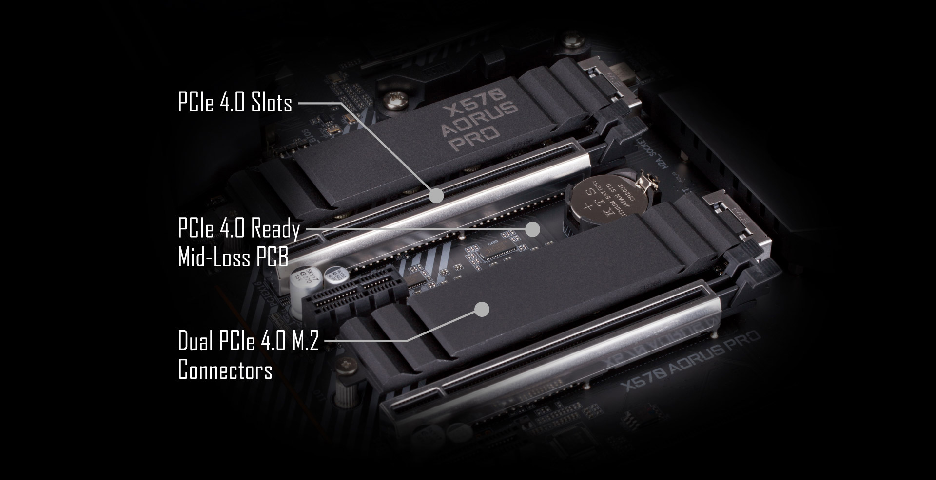 X570 AORUS Series Motherboards feature built-in PCIe 4.0 slots, delivering superior bandwidth compared to that from previous generation technology. Performance of Graphics cards and PCIe NVMe AIC SSDs will not be limited by insufficient bandwidth.