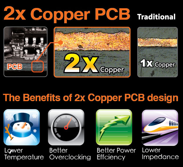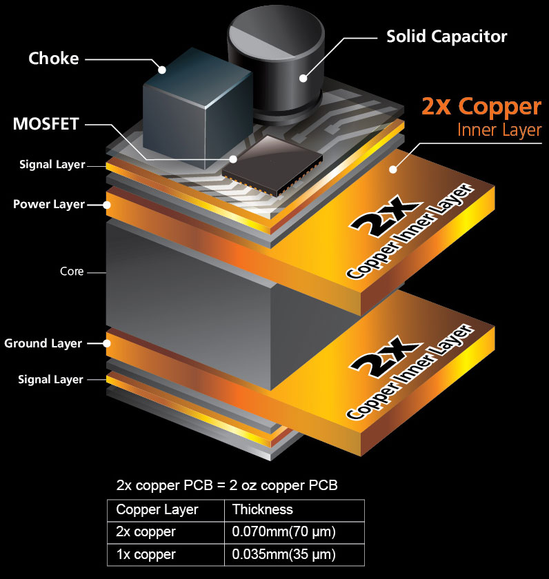 GIGABYTE's exclusive 2X copper PCIe 4.0 Ready PCBs design provides sufficient power trace paths between components to handle greater than normal power loads and to remove heat from the critical CPU power delivery area. This is essential to ensure the motherboard is able to handle the increased power loading that is necessary when overclocking.