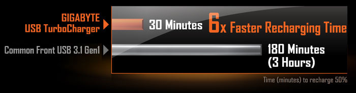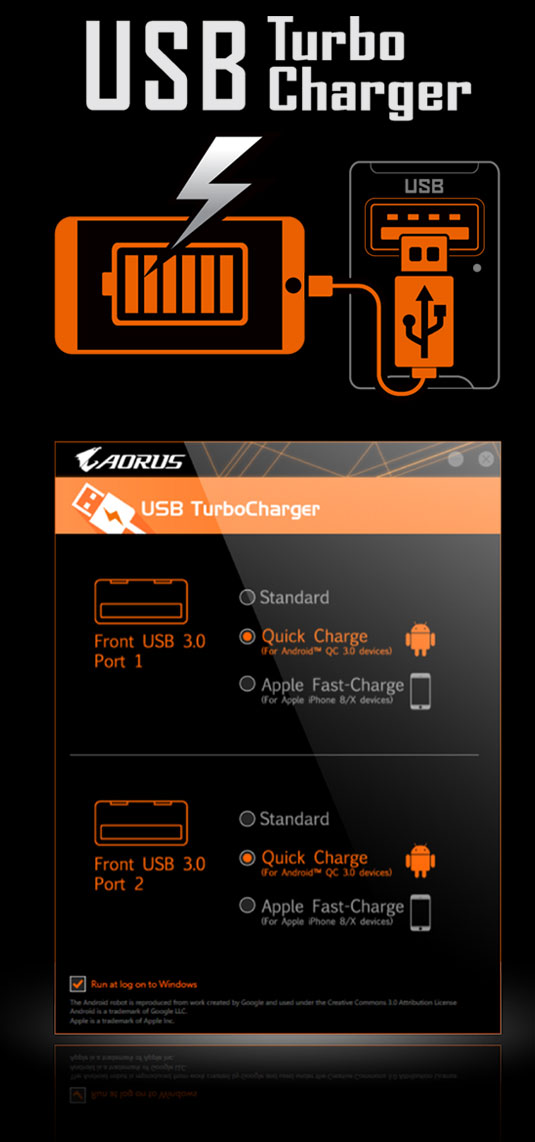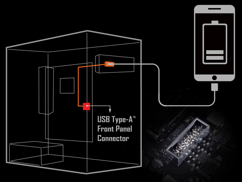GIGABYTE patent pending USB TurboCharger technology allows users to recharge their mobile devices with stunning speed, up to 50% in less than 30 minutes*. By connecting Front USB 3.2 Gen1 Type-A cable of chassis to our motherboard, USB TurboCharger can recharge both Android devices with QC 3.0 and Apple devices with Apple Fast-Charge function.