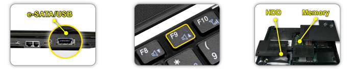 e-SATA/USB ComboHaving e-SATA and USB in the meantime, especially the cutting-edge e-SATA interface with a maximum data transmission rate at 300MB per second, allowing users to enjoy transcendent data transmission speed as an external hard disk. Express System RecoveryBy a quick click on F9, experience the Express Recovery to restore factory default easily. Easy upgrade for HDD and MemoryWhen the need for more storage space or higher memory capacity arises, the special modularized-design of the Q1458 allows for quick and easy hassle-free upgrading. |