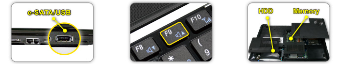 e-SATA/USB ComboHaving e-SATA and USB in the meantime, especially the cutting-edge e-SATA interface with a maximum data transmission rate at 300MB per second, allowing users to enjoy transcendent data transmission speed as an external hard disk. Express System RecoveryBy a quick click on F9, experience the Express Recovery to restore factory default easily. Easy upgrade for HDD and MemoryWhen the need for more storage space or higher memory capacity arises, the special modularized-design of the Q1458 allows for quick and easy hassle-free upgrading. |