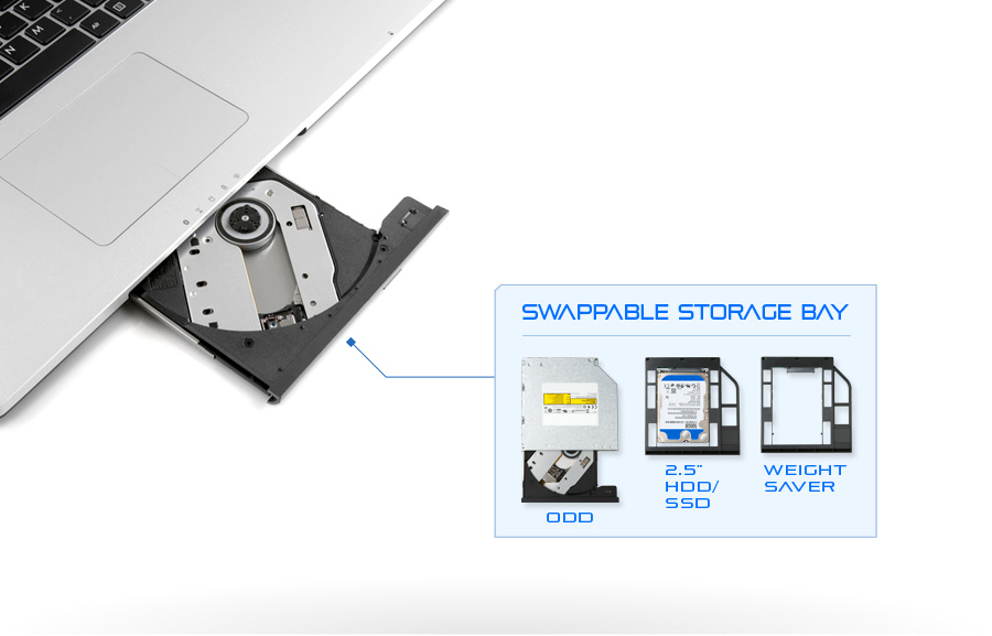 The ingenious design of simple-swap, removable DVD-ROM / HDD slot* from GIGABYTE team gives you the option of slotting a DVD-ROM or an HDD. Likewise, you may also swap for an empty slot to travel light and maximize mobility.