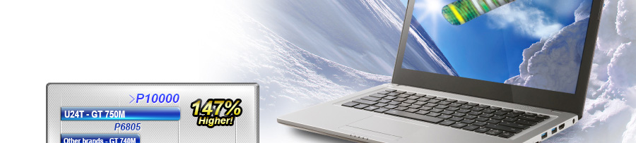 Experience a powerful performance like no other. The U24T comes equipped with the latest NVIDIA® GeForce® GT 750M 2GB GPU that breaks the limitations of Ultrabook™ graphics performance. The unrivaled power of GT 750M 2GB GPU with its impressive score of P10,000 on 3DMark Vantage is capable of delivering an incredible gaming and multimedia processing experience.