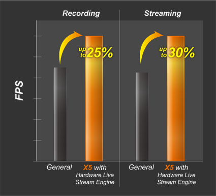 이제 AORUS X5에서 게임을 플레이 하십시요! 통합된 하드웨어 실시간 스트리밍 엔진은 추가 압축기 연결의 혼란을 없앴습니다. 시스템 성능과 게임 플레이 프레임을 저하 시키지 않으면서 고화질 영상을 동시에 기록하고 스트림합니다. 실시간 스트리밍 엔진은 소프트웨어 모드에서 스트리밍과 기록보다 최대 30% 추가 fps를 제공합니다.
