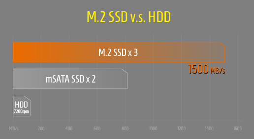 더 빠른 게이밍을 원한다면 AORUS RAID Xpress를 이용하세요. AORUS RAID Xpress는 3개의 M.2 SSD를 RAID 0으로 구성을 하면 최대 1500MB/s의 성능으로 작동을 하여 HDD를 이용할 때보다 12배 더 빠르고 mSATA SSD보다 3배더 빠르게 노트북을 이용할 수 있습니다.